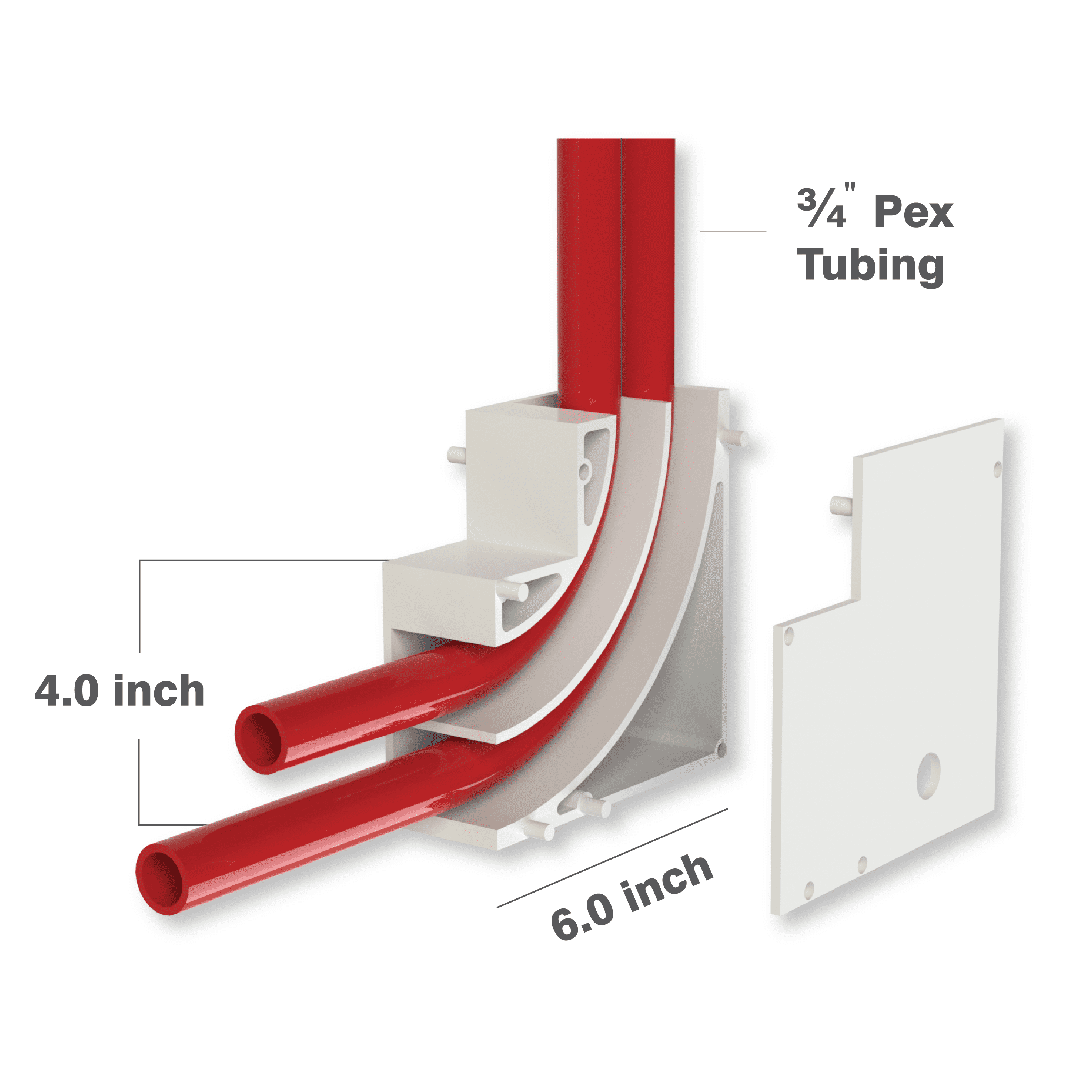 - Maintains a larger bend radius than manufacturers’ recommended minimum for 3⁄4” and smaller PEX tubing