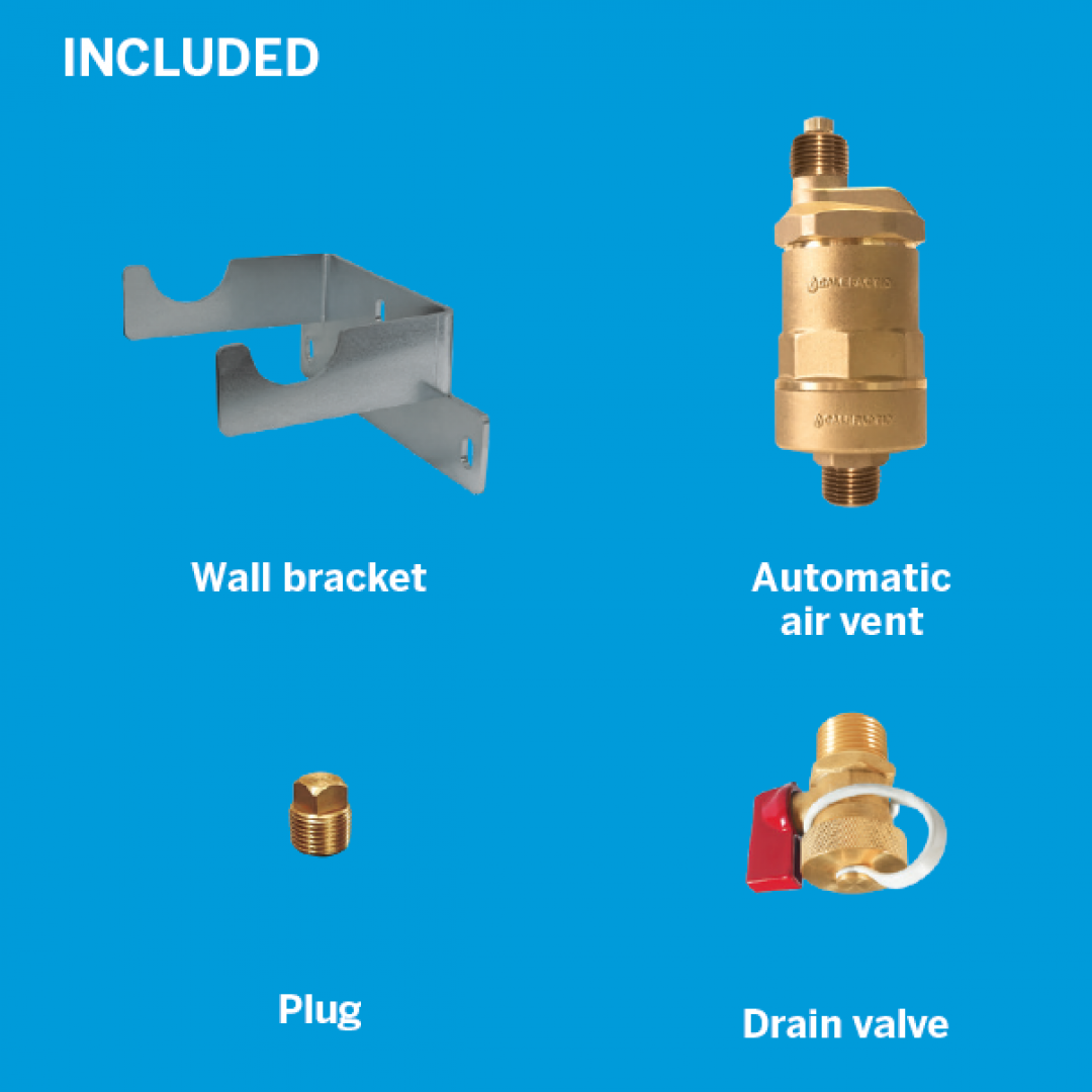 - Included - Drain Valve, Automatic Air Vent, Wall Bracket, Plug